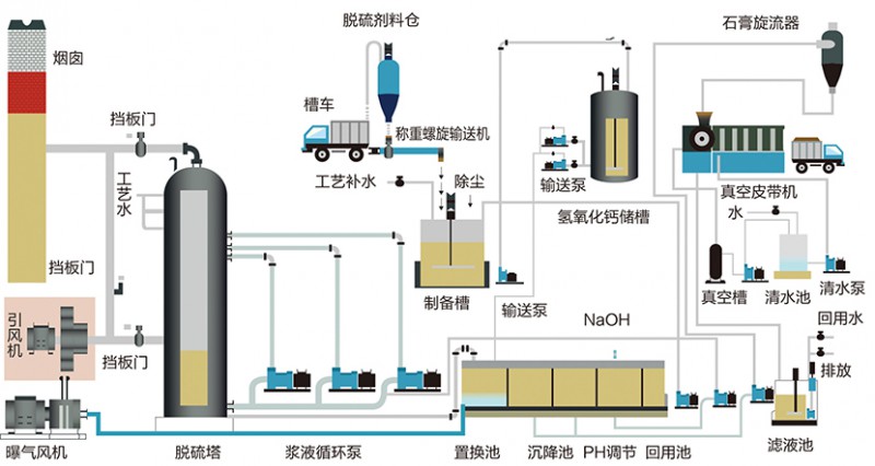 鈉-鈣雙堿法采用火堿吸收SO2  ,石灰還原再生,再生后吸收劑循環使用,無廢水排放。窯爐煙氣經除塵器除塵后進入脫硫塔,并與脫硫液中的堿性脫硫劑在霧化區內充分接觸反應,完成煙氣的脫硫吸收。